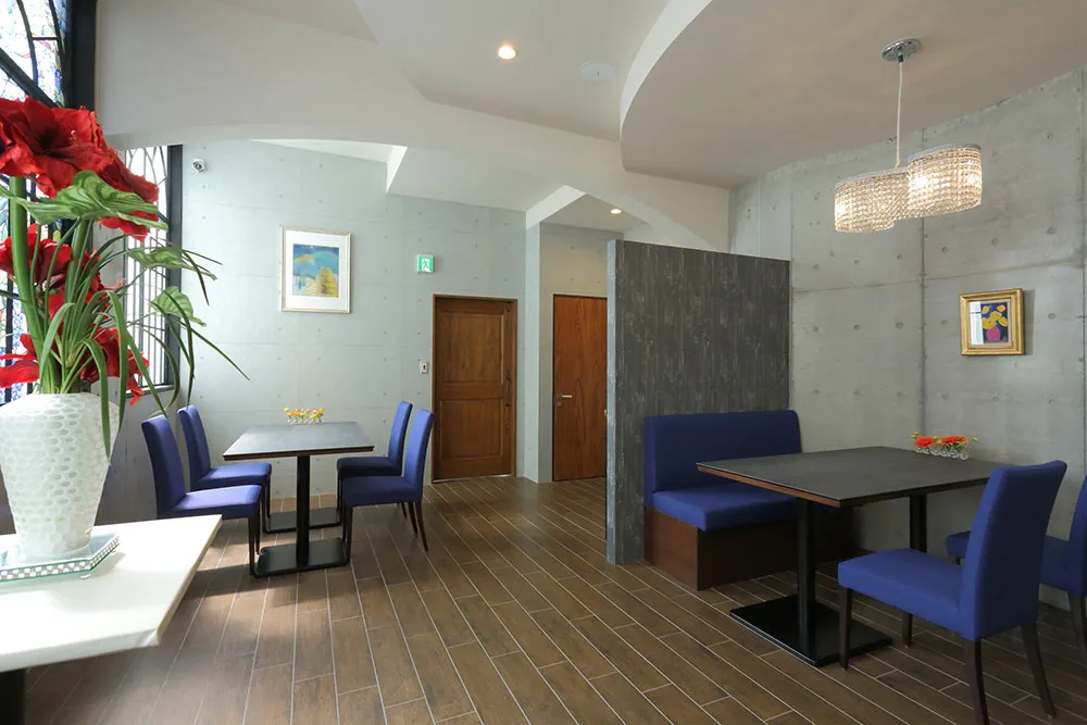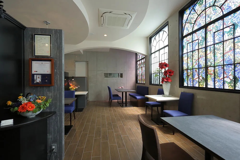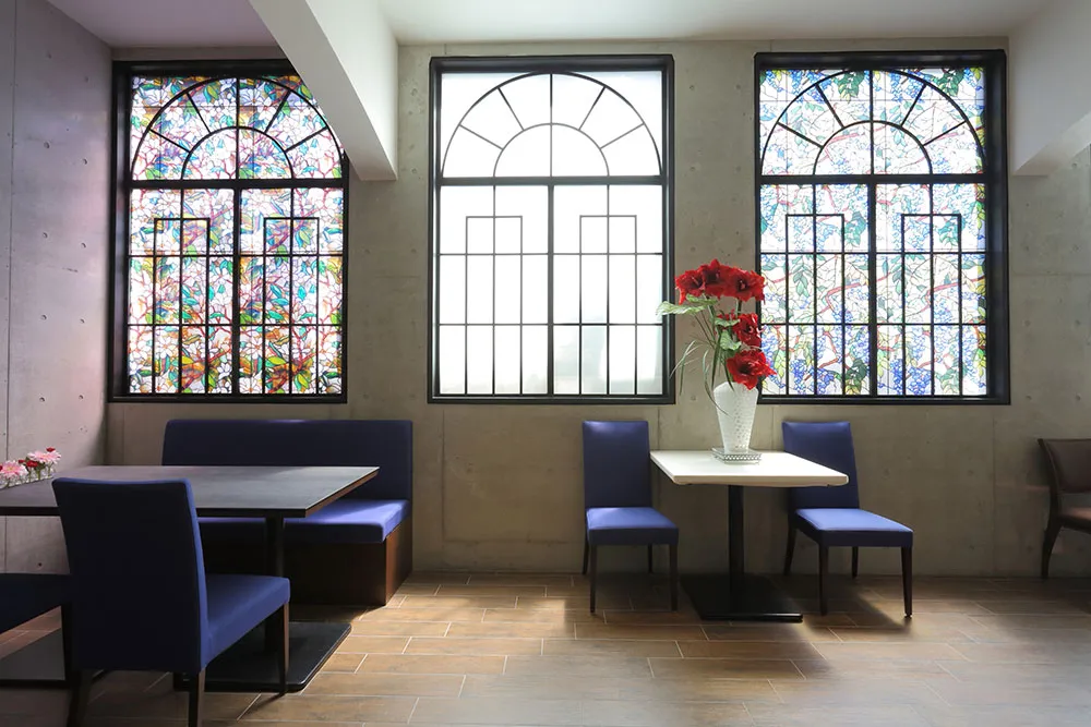 晴れの日は、大きなステンドグラス風の窓から太陽の光が差し込み、華やかで明るい空間をお楽しみいただけます。